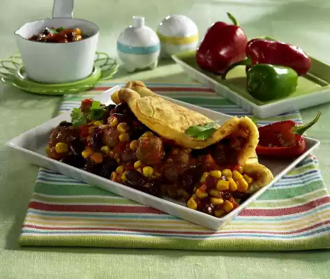 Add chilli, garlic and paprika and sauté. Drain the Texas mix and put it in the pan. Deglaze with Texicana Salsa. Bring to the boil and keep warm. Meanwhile whisk eggs, milk, mineral water and flour.