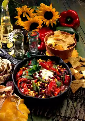 Clean, wash and cut the peppers into pieces. Peel and finely chop the onion. Wash and drain the beans. Heat the oil in a pan, fry the peppers in it for about 8 minutes at medium heat, add the onions, red beans and corn and fry for about 3 minutes.
