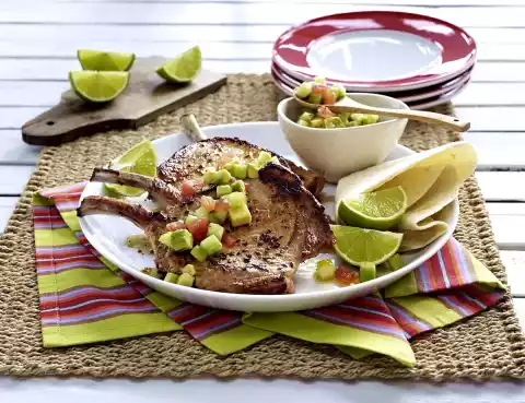 Heat 1 tablespoon of oil in 2 pans. Fry the meat for 5-6 minutes while turning, season with salt and pepper. Prepare the tortilla flat cakes according to the instructions on the packet. Quarter the lime. Arrange meat with avocado salad, lime quarters and tortilla flat cakes