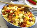 Pour the pasta mixture into an ovenproof dish. Crumble nachos over it, leaving some whole. Sprinkle with remaining cheese, spread butter in flakes and remaining chilli peppers on top and bake in the preheated oven (electric cooker: 200 °C/ convection oven: 175 °C/ gas: level 3) for 20-25 minutes.
