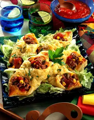 Separate 1 egg. Spread the edges of the dough with egg white. Put some mince mixture in the middle of each edge. Spread chilli sauce over it. Fold 2 corners over the filling and press them together. Whisk egg yolk and cream. Grate cheese finely. Spread the puff pastry pockets with egg yolk and sprinkle with cheese. Bake in the preheated oven (electric cooker: 200-225 °C / convection oven: 175-200 °C / gas: level 3-4) for approx. 20 minutes