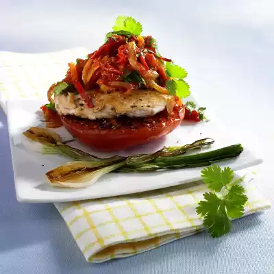 Put some coriander leaves aside for garnishing, chop remaining leaves and stir into the salsa. Arrange fried tomato half and spring onion on a plate. Layer meat and salsa on the tomato half one after the other. Garnish with remaining coriander, sprinkle with pepper