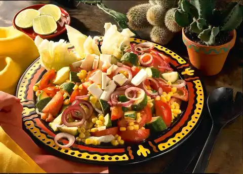 Mix lime juice, salt, cayenne pepper, garlic and olive oil to a salad dressing, mix with the vegetables. Cut the cheese into wide strips. Arrange the vegetables with the salad dressing on the plate. Put pieces of cheese on top.