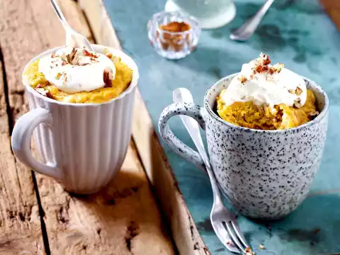 Spread the dough into greased and floured cups and cook in the microwave at 800 watts for 2 1/2 - 3 minutes, cup by cup. Take out the cake and let it cool down. Whip cream until stiff and put 1 blob on each cake.