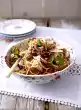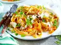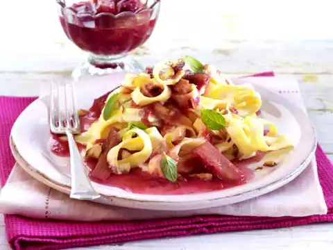 Roughly chop the almonds. Wash the mint, shake dry and pluck the leaves from the stalks. Arrange noodles and rhubarb on plates. Sprinkle mint and almonds on top.