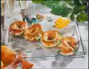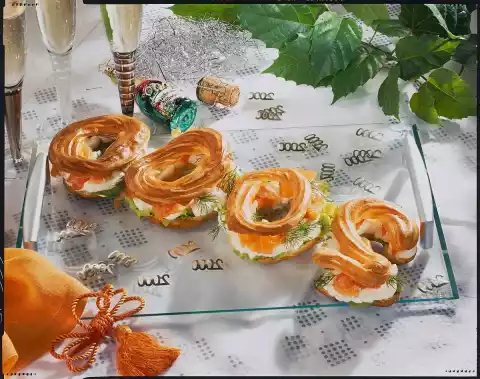 Cover the lower halves of the dough with salad, spread with cream cheese and top with salmon. Sprinkle with onion and dill. Put the lid on