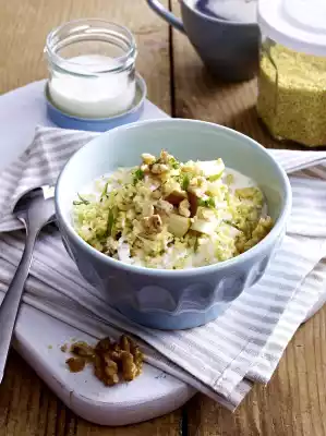 Cook the millet in salted water over medium heat for 20-25 minutes until firm to the bite. Roast walnuts in a pan without fat. Remove, let cool and chop finely. Wash the mint, shake dry and cut the leaves into strips.