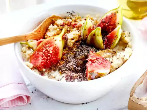 Wash the figs and cut into slices. Put the porridge in bowls, spread figs on top and sprinkle with chia seeds.