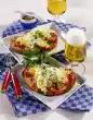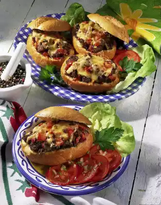 2 minutes before the end of the baking time, place the tops of the rolls on the minced meat mixture and bake with it. Arrange on a plate and serve garnished with salad and parsley as desired. Tomato salad tastes good with it.