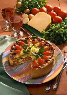 Cut the remaining tomato halves and place them on the filling. Sprinkle with grated cheese and bake in the preheated oven (electric range: 200 ° C/ gas: level 3) for about 45 minutes. Cover the cake for the last 15 minutes if necessary.