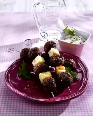 Form into 24 small balls and put them on the skewers with the cheese. Lightly grease a grill tray and grill the skewers in it for about 15 minutes. Arrange the skewers and garnish with parsley. Add dip