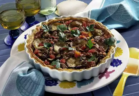 Grease an ovenproof casserole dish and line it with the pastry sheet. Press the rim firmly. Dab aubergine slices dry with kitchen paper. Layer minced meat and aubergines in the dish. Bake in a preheated oven (electric: 200 °C/ gas: level 3) for 25-30 minutes.