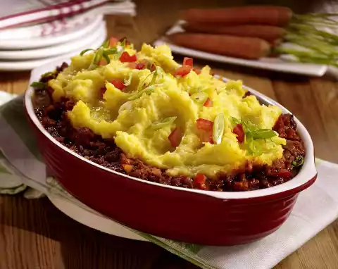 Drain the potatoes, add the milk-fat mixture and mash with a potato masher. Season with nutmeg. Put the minced meat in an ovenproof dish and spread mashed potatoes on top. Bake in the preheated oven (electric cooker: 175 °C/ convection oven: 150 °C/ gas: level 2) for 18-20 minutes.