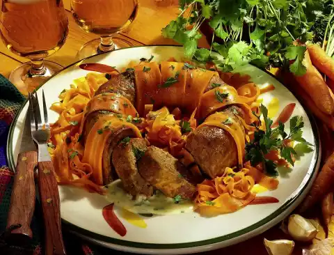 Season with salt and cayenne pepper. Drain the carrots, collect the stock, add water to 500 ml liquid and bring to the boil. Stir in the contents of the sauce packet and boil for 1 minute. Chop the coriander leaves and fold into the carrots. Add some sauce to the minced meat ring. Place the carrots on and around the minced meat ring and garnish with parsley. The rest of the sauce is extra. Boiled potatoes taste good with it
