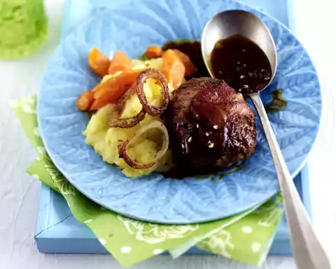 Heat 2 tablespoons of oil in a large frying pan. Fry the medallions for 6-8 minutes on each side. Take them out and keep them warm. Fry onion rings in hot frying fat while turning them golden brown.