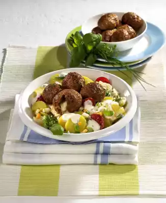 Season to taste with salt and pepper. Cut the potatoes into slices. Dice eggs. Mix all prepared ingredients. Flavour with salt and pepper. Serve meatballs with salad. Garnish with put aside herbs.
