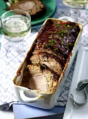 Shape the mince on a piece of baking paper into a rectangular flat plate (approx. 25 x 30 cm). Place the fillet on top and roll up. Put the minced meat roll in a box or pie tin (25 cm long; approx. 1 l capacity), press it slightly into shape.