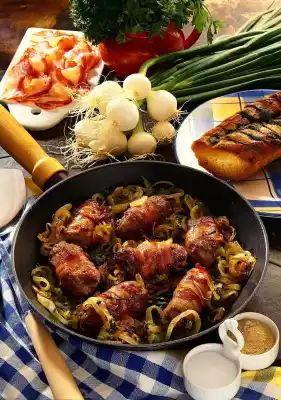 Dice 1 onion, cut remaining onions into rings. Knead the minced meat with the bread roll pressed out, diced onion and eggs. Season with salt and pepper. Form 12 rolls, wrap with bacon and fry in hot oil for about 10 minutes. Add onion rings and fry for 10 minutes. In the meantime clean, wash and cut the spring onions into rings. Herb baguette in a preheated oven (electric cooker: 200 °C/