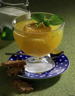 Measure out 3/4 litre juice. Boil up sugar, juice and half of the lime rasp. Allow to cool slightly, dissolve the squeezed gelatine in it. Put 2 slices of gelatine in 4 portion glasses, add jelly. Put in a cool place and let it jelly. Decorate with lemon balm leaves and the remaining grated lime. Serve with vanilla sauce and biscuits as desired