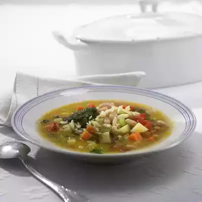 It is best to soak the beans in plenty of water overnight. Then cook for about 1 hour and let them drain. In the meantime peel potatoes and carrots, clean zucchini and celery. Wash the vegetables and cut them into cubes of about 1 cm. Peel and finely dice the onions. Dice bacon also finely. Clean and wash the tomatoes and cut them into large pieces. Leave the bacon in a large pot until crispy and take it out again. Melt butter in the bacon fat. Sauté onions in it until golden brown. Add prepared potato, carrot, zucchini and celery vegetables. Season with salt and pepper. Fry for about 5 minutes without browning. Add tomatoes, bay leaf and parsley bouquet. Deglaze with bouillon, add beans and bring to the boil. Cover and cook for about 30 minutes. Cook pasta (either during the last) 12 minutes (add to soup or cook extra) in salted water. Put bacon back into the soup, season if necessary. For the pesto basil, wash, shake dry and remove leaves. Peel and chop the garlic. Puree pine nuts, basil and parmesan. Pour in olive oil. Season with salt and pepper. Serve pesto and possibly pasta with the soup