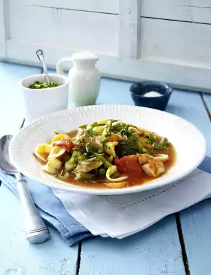 Remove meat from the broth. Add broccoli, carrots and remaining tomatoes to the stock, bring to the boil and cook over medium heat for about 8 minutes. Cook pasta in boiling salted water according to package instructions.