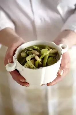 Bring the stock to the boil. Heat the oil in a large pot, fry the onions and garlic until transparent. Add green beans, sauté briefly and pour on the hot stock. Add 1 teaspoon salt, bring to the boil, cover and cook for about 20 minutes. After about 10 minutes add fennel, zucchini and spring onions and bring to the boil. Drain the white bean seeds on a sieve. Add sugar snap peas and bean seeds to the vegetables approx. 3 minutes before the end of the cooking time and cook at the same time. Season the finished soup with salt and pepper. Serve with roasted ciabatta slices with pesto