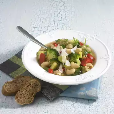 Sauté the garlic and vegetables. Add broth, noodles and marjoram, bring to the boil and cook for about 5 minutes. Season minestrone with salt and pepper and put it on a plate. Garnish with marjoram and parmesan slices.