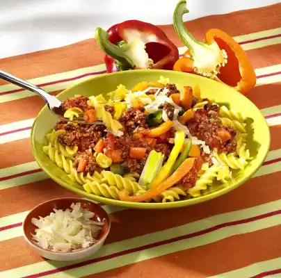 Season with salt and pepper and simmer covered for 10-15 minutes. In the meantime, put Fusilli in boiling salted water and cook for about 13 minutes. Drain the pasta and let it drain. Season the minced sauce with salt and pepper and serve with the noodles.