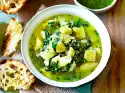 Heat 2 tablespoons of oil in a large pot. Fry carrots, celery, spring onions and 1⁄3 garlic in it. Add tomato paste and sauté briefly. Add tomatoes and thyme. 1 1⁄2 Pour on 1 l water, bring to the boil. Stir in the stock and simmer the soup covered over medium heat for about 15 minutes.