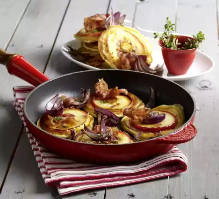 Fry the pancakes until golden brown, turning them over. After turning, add some onions and bacon to the pan, heat up and serve.