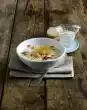 Onions peel and cut into slices. Halve bacon slices and let them crisp in a hot pan. Drain bacon on kitchen paper. Fry the onion slices in the bacon fat. Add marjoram at the end and keep warm.