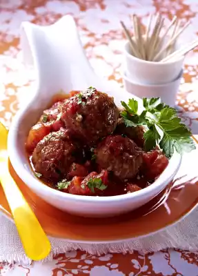 4 Boil the tomatoes for 30 seconds, then refresh and peel them. Open them, remove the seeds, then finely chop the flesh. Fry the remaining onion and garlic in an oiled pan, then put the meatballs in it for about 8 minutes. Add the lemon juice and simmer for 5 minutes. Sprinkle the chopped parsley and serve.
