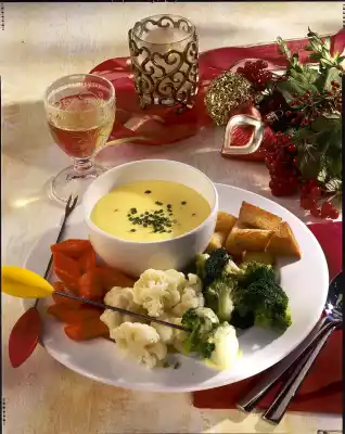 Cut bread into cubes. Fry in hot fat until golden brown. Pour hot cheese mixture into 4 preheated bowls. Sprinkle with chives. Serve with bread and vegetables.