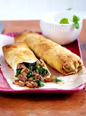 Place 2 pastry sheets next to each other, slightly overlapping. Spread approx. 1/5 of the spinach mince mixture on each end, leaving a small rim on the sides. Whip the sides over the filling and roll up from the filling.