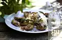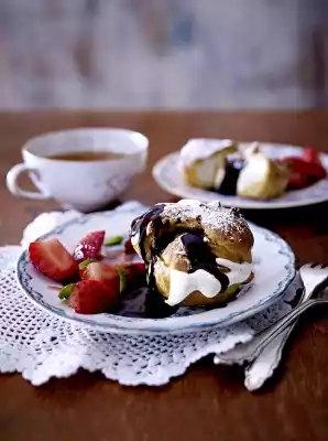 For the chocolate sauce, boil 125 ml water, 100 g sugar and 1 pinch of salt in a saucepan. Stir in the cocoa powder with a whisk. Let everything boil while stirring constantly. Remove from heat and stir in 100 g cream. Let it cool down. Wash, clean and chop the strawberries. Mix with 2 tablespoons of sugar and set aside. Wash mint, shake dry and remove leaves. Remove cream puffs from the freezer about 30 minutes before serving. Sprinkle strawberries with mint. Serve cream puffs with chocolate sauce and strawberries