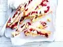 For the vanilla cream, mix vanilla pulp with crème fraîche and 75 g sugar. Whip 650 g cream until stiff, fold in. Use a saw knife to cut the cream puff in half horizontally, but do not cut through completely. Carefully fill the vanilla cream into the cream puffs with a spoon. Freeze for at least 2 hours