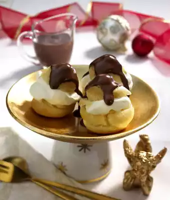 Pour the choux pastry into a piping bag with a large perforated spout. Spray 6 tuffs each onto 2 baking trays lined with baking paper. Fill an ovenproof dish with water and place on the bottom of the oven. Bake the baking trays one after the other in a preheated oven (electric cooker: 225 °C/ convection oven: 200 °C/ gas: level 4) for 20-25 minutes. Remove the finished cream puffs from the oven and cut them open immediately with scissors. Let them cool down. Whip 150 g cream until stiff, briefly stir in liqueur and vanilla sugar. Fill the lower halves of the cream puffs with cream, place the lid on top and chill. Break chocolate into pieces for the sauce.