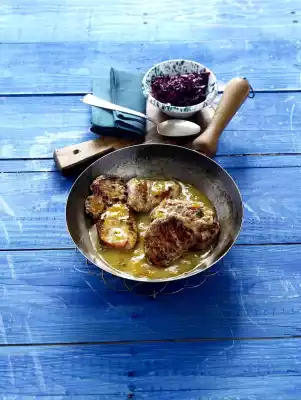 Heat 1 tablespoon of oil in a frying pan, fry the escalopes for about 2 minutes on each side, remove. Add thyme to the frying oil and fry briefly. Deglaze with juice and 250 ml water. Add broth and grated skin, simmer for about 5 minutes. Stir starch with a little water until smooth, thicken sauce with it. Season to taste with salt, pepper and honey. Refine red cabbage with jelly. Warm the cutlets in the sauce. Add red cabbage. Tastes good with mashed potatoes or ciabatta bread