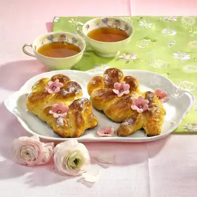 On the other side, press the braid together about 2 cm before the end so that the ends of the strands look like the fringes of a braid. Whisk the egg yolk and cream and spread the plaits with it. Bake in the preheated oven (electric range: 175 °C/ convection oven: 150 °C/ gas: level 2) for 30-35 minutes. Cover with aluminium foil after about 20 minutes baking time. Remove the plaits and immediately brush with the remaining whisked egg yolk. Leave to cool and decorate with e.g. marzipan flowers