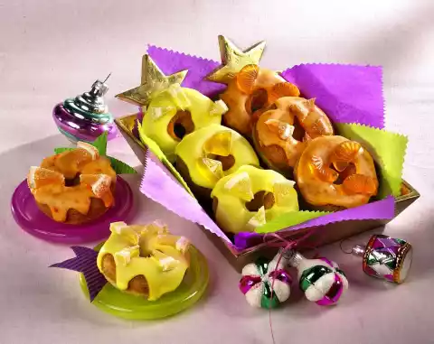Leave to cool. Mix icing sugar and lemon juice to a smooth glaze, halve the glaze. Colour one half yellow, the other half orange with yellow and red. Dribble onto the cakes. Cut jelly fruits into small pieces. Press fruit pieces and fruit gum into the fresh icing. Let dry