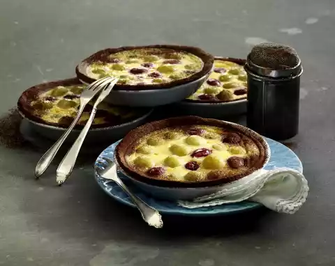 Knead the dough again, roll out and cut out 2 more circles. Line 6 greased porcelain cups (14 cm Ø) with the dough. Spread grapes on the ramekins and pour over with the icing. Bake in the preheated oven (electric range: 175 °C/ convection oven: 150 °C/ gas: level 2) for 30-40 minutes. Take the ramekins out of the oven and let them cool down on a cake rack. Dust the rim with cocoa before serving