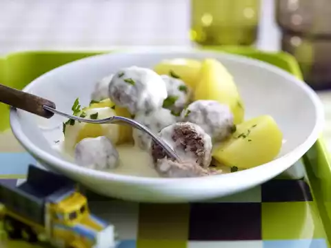 In the meantime, peel and wash the potatoes, cover and cook in salted water for about 20 minutes. Lift the finished meatballs out of the stock with a skimmer. Pour stock through a fine sieve and measure 1/2 l.