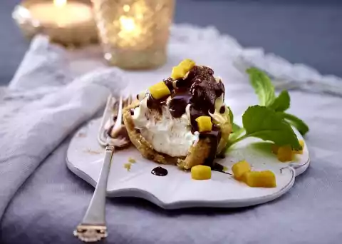Peel the mango and chop it finely. Beat the sour cream and sugar with the whisk of the mixer until stiff. Pour into a piping bag with star-shaped spout. Carefully lift the cookie bowls out of the bowls. Pour in the sour cream.