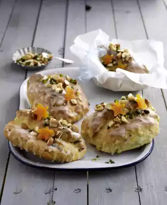 Roll out each piece to a rectangle (approx. 10 x 15 cm). Whip the transverse side twice to the middle (2/3 of the surface) and press firmly. Place the stollen on a baking tray lined with baking paper and leave to rise for another 10-15 minutes. Bake in a preheated oven (electric: 175-200 °C/ gas: level 2-3) for 25-35 minutes. Sift icing sugar into a bowl. Add lemon juice and mix to a smooth glaze. Remove the stollen from the oven, let it cool down briefly and brush with the icing. Immediately sprinkle with remaining nuts and decorate with the apricot stars