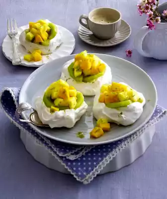 Just before serving, cover the pavlovas with slices of kiwi and spread the pineapple-mango cocktail on top.