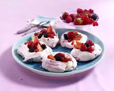 Dribble the raspberry puree over the meringue and carefully fold it in streaks. Line a baking tray with baking paper. Place the beaten egg whites in 6 portions on the baking tray. Use a teaspoon to press a small depression into each portion. Bake in a preheated oven (electric cooker: 125 °C/ convection oven: 100 °C/ gas: not suitable) for 1 hour. Turn off the oven and let the pavolas cool down overnight. Clean and sort the remaining berries. Cut large berries smaller if necessary. Mix honey and lemon juice. Marinate the berries carefully.