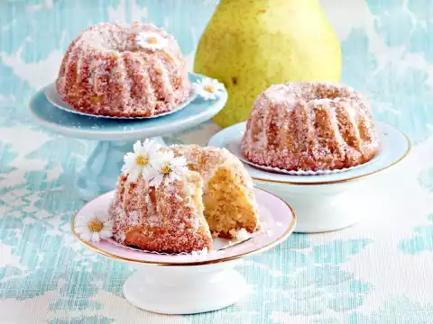 Mix flour, starch and baking powder. Beat butter, 250 g sugar and vanilla sugar until creamy with the whisk of the hand mixer. Stir in the eggs one by one. Add lemon zest and stir in. Stir in flour mixture. Peel, quarter and core the pear. Grate pear roughly and fold into the dough