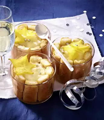 6 When serving, remove the film. Wash and dry the carambola, slice it. Decorate the verrines with the silver beads.