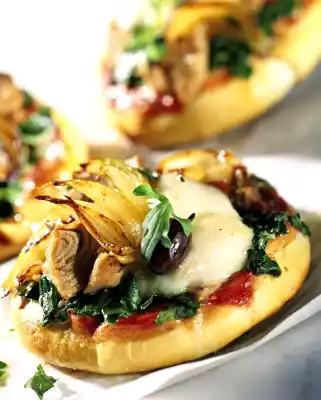 Roll out the dough pieces with a dough roller or with your hands to a diameter of about eleven centimetres or press flat. Place on a baking tray lined with baking paper. Spread tomato sauce on the dough and generously cover with rocket, tuna, onions, olives and mozzarella. Bake in a preheated oven (electric: 200 °C/ gas: level 3) for 15 to 20 minutes. Sprinkle with remaining rocket leaves and serve immediately. Makes four small pizzas