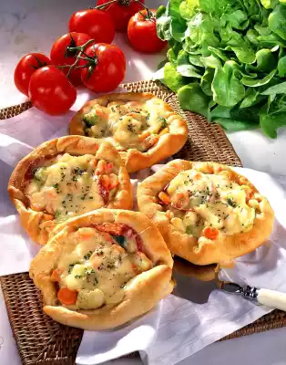 Roll out the dough and cut into 4 equal pieces. Sprinkle 1 tsp. breadcrumbs in the middle of each. Spread the vegetables on top. Put 2 slices of salami on each. Wrap the dough corners towards the middle and press them lightly